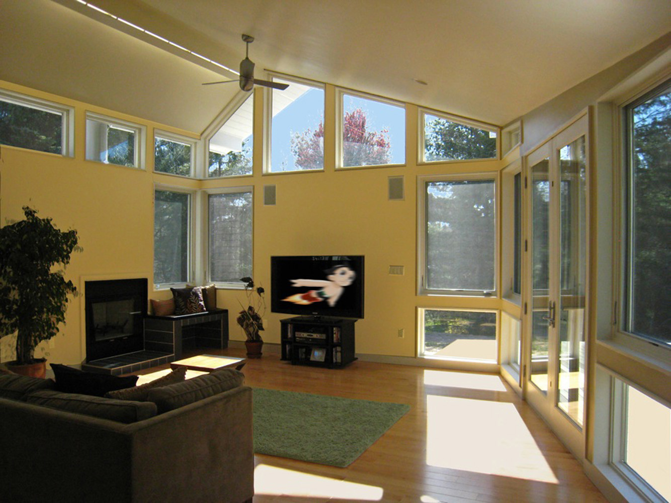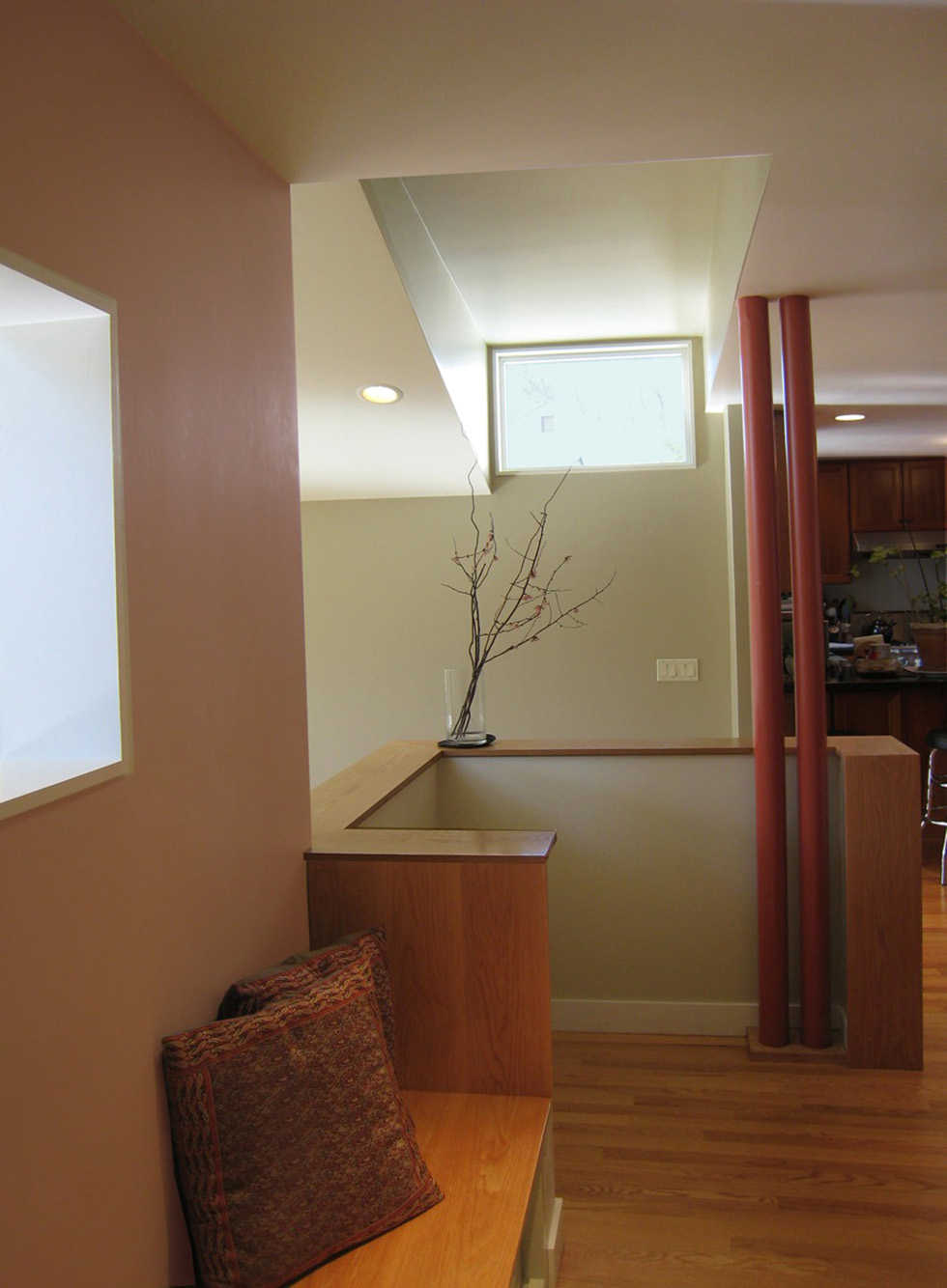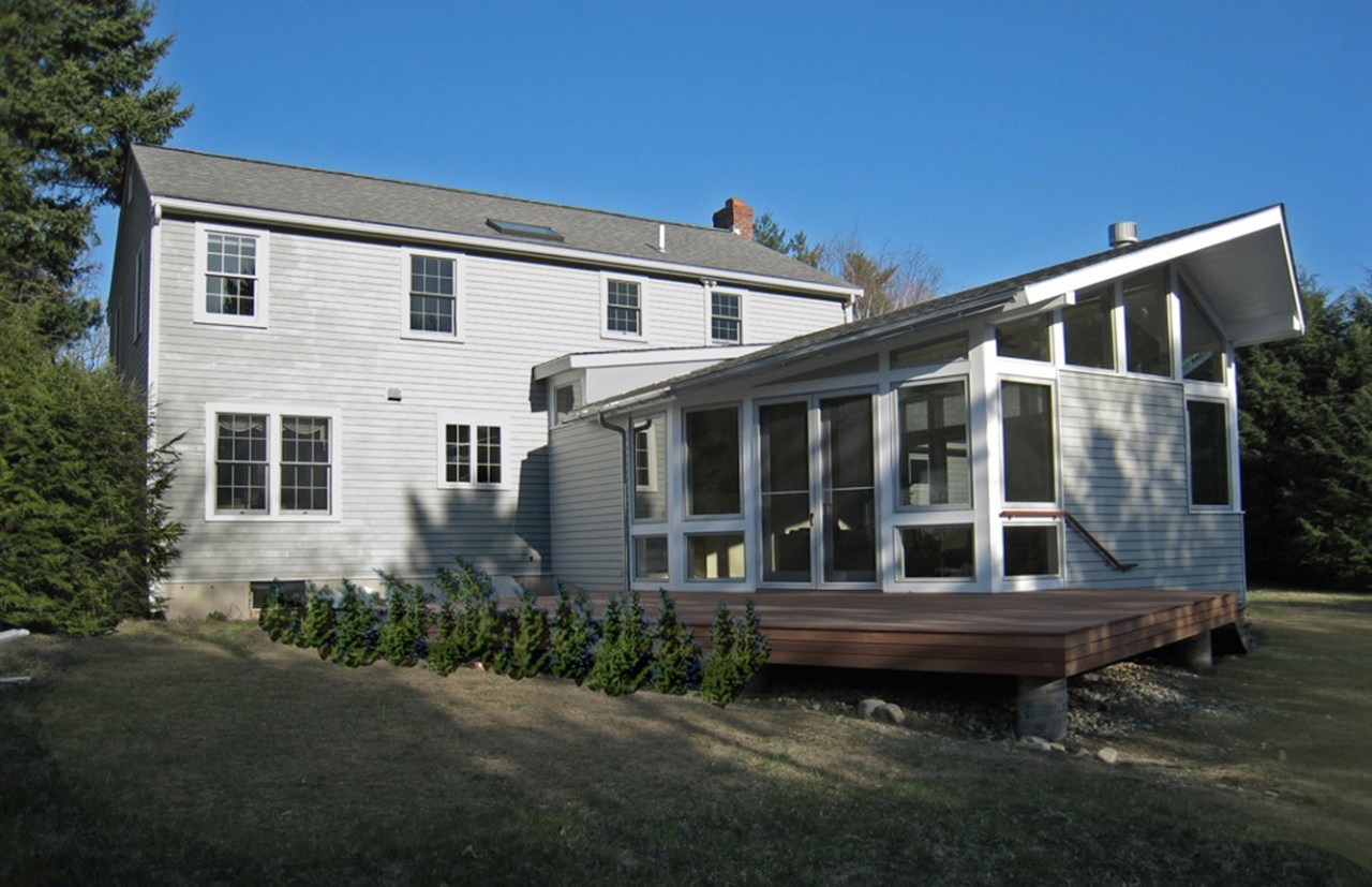 Boehm Architecture, Designer with Principal, Client and Consultant Coordination, Full Documentation, Construction AdministrationA family room addition and partial renovation to a colonial home in Andover. The design makes use of the asymmetrical salt box form, opening up to the outdoors with expansive glazing and a large deck area, on level with the interior space. The connection between addition and existing becomes a moment of intricacy, with a clerestory and formal change in scale defining an entry area, shoe changing zone, and Loosian ‘theater box’ approach to the family room.