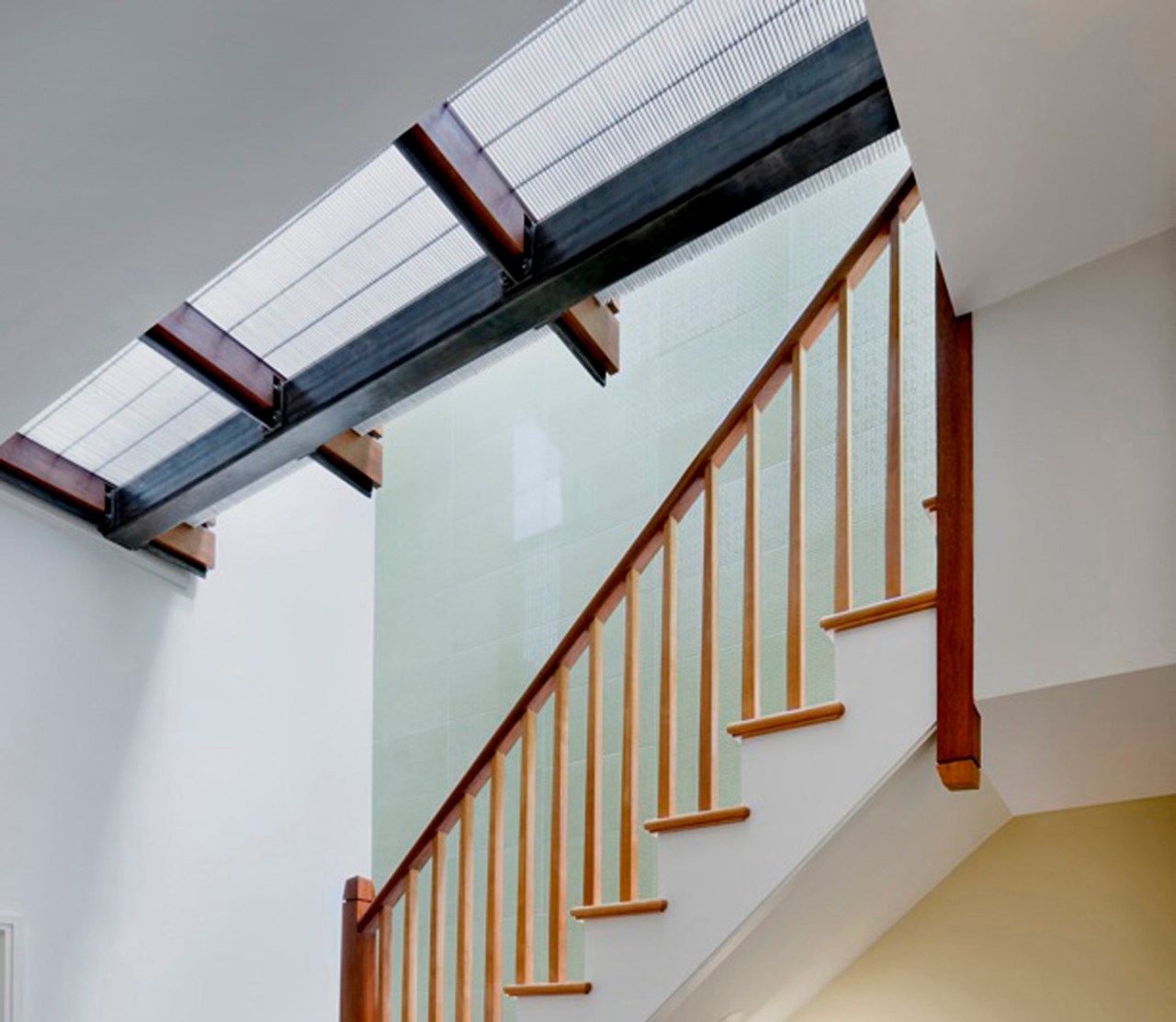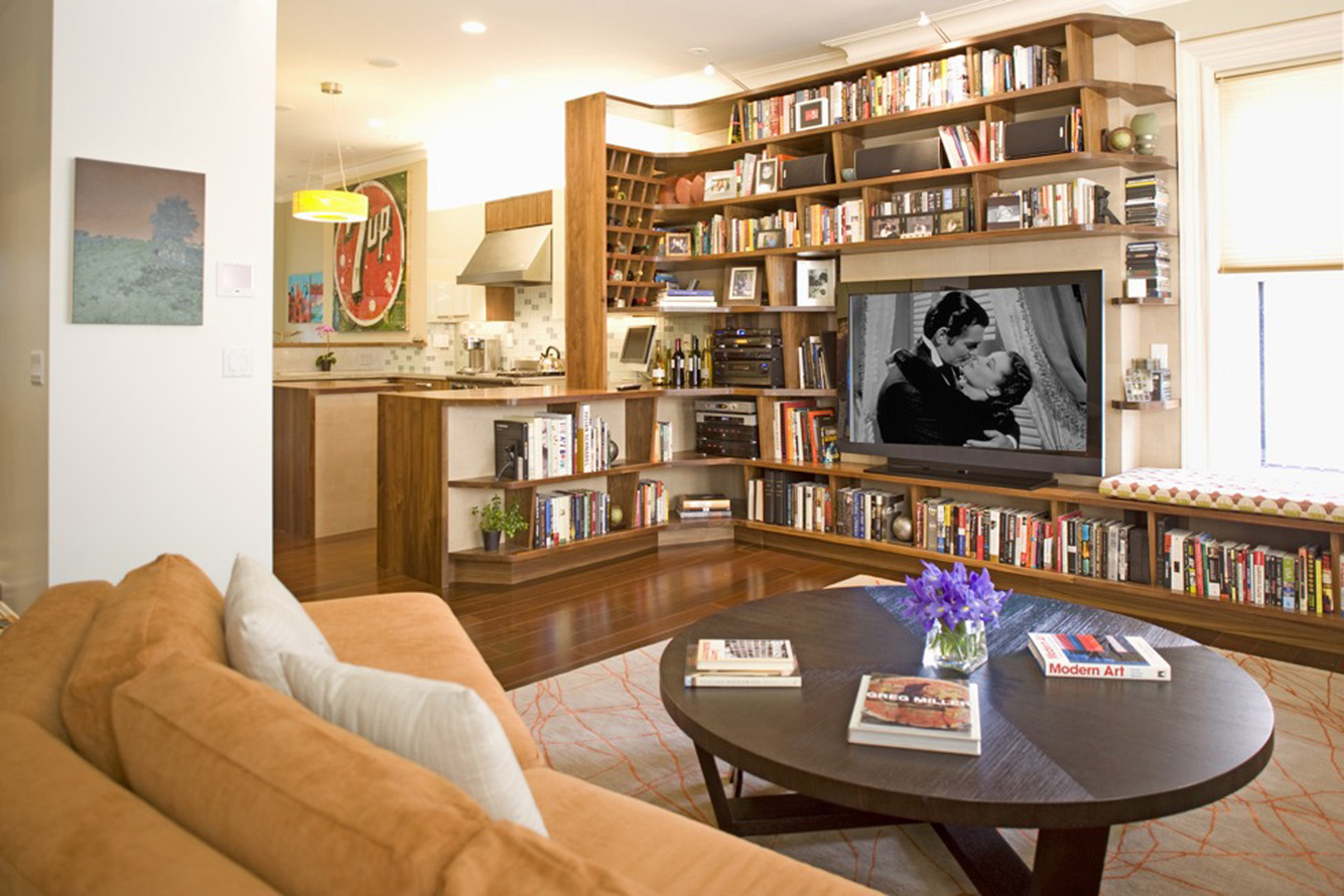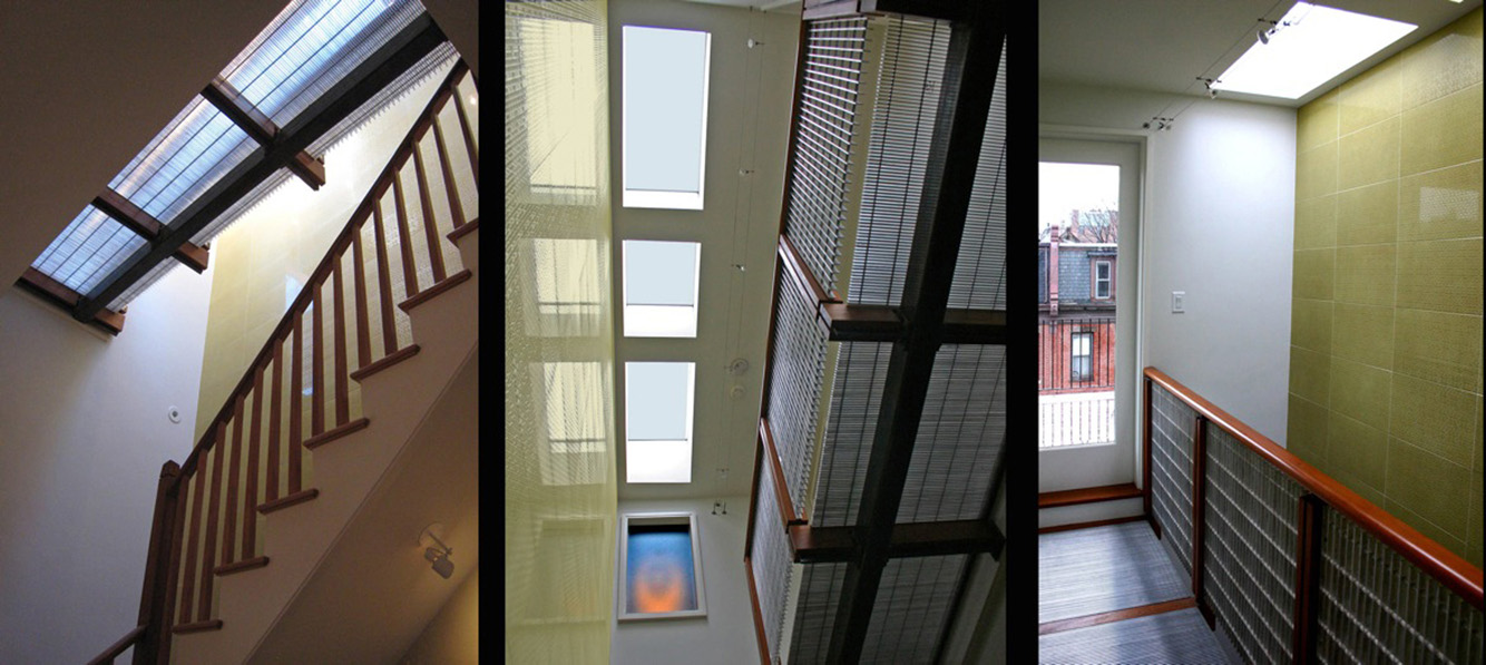 Boehm Architecture, Designer with Team, Client and Consultant Coordination, Full Documentation, Construction AdministrationDeep renovation to a Back Bay Townhouse, including complete refinishing of the entire building, new custom designed and CNC cut walnut and maple shelving and cabinetry areas, light capturing stair and walkway elements, and contemporary reconsideration of the traditional detailing of Boston architectural elements.
