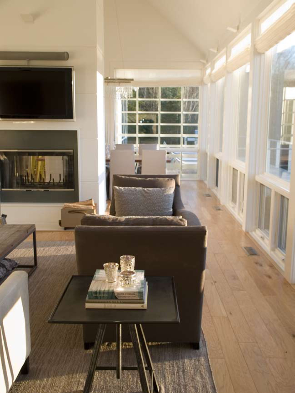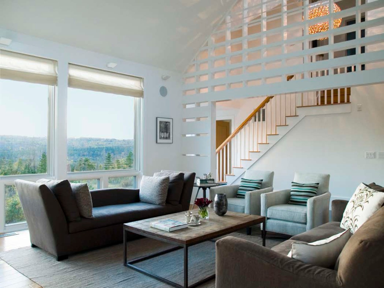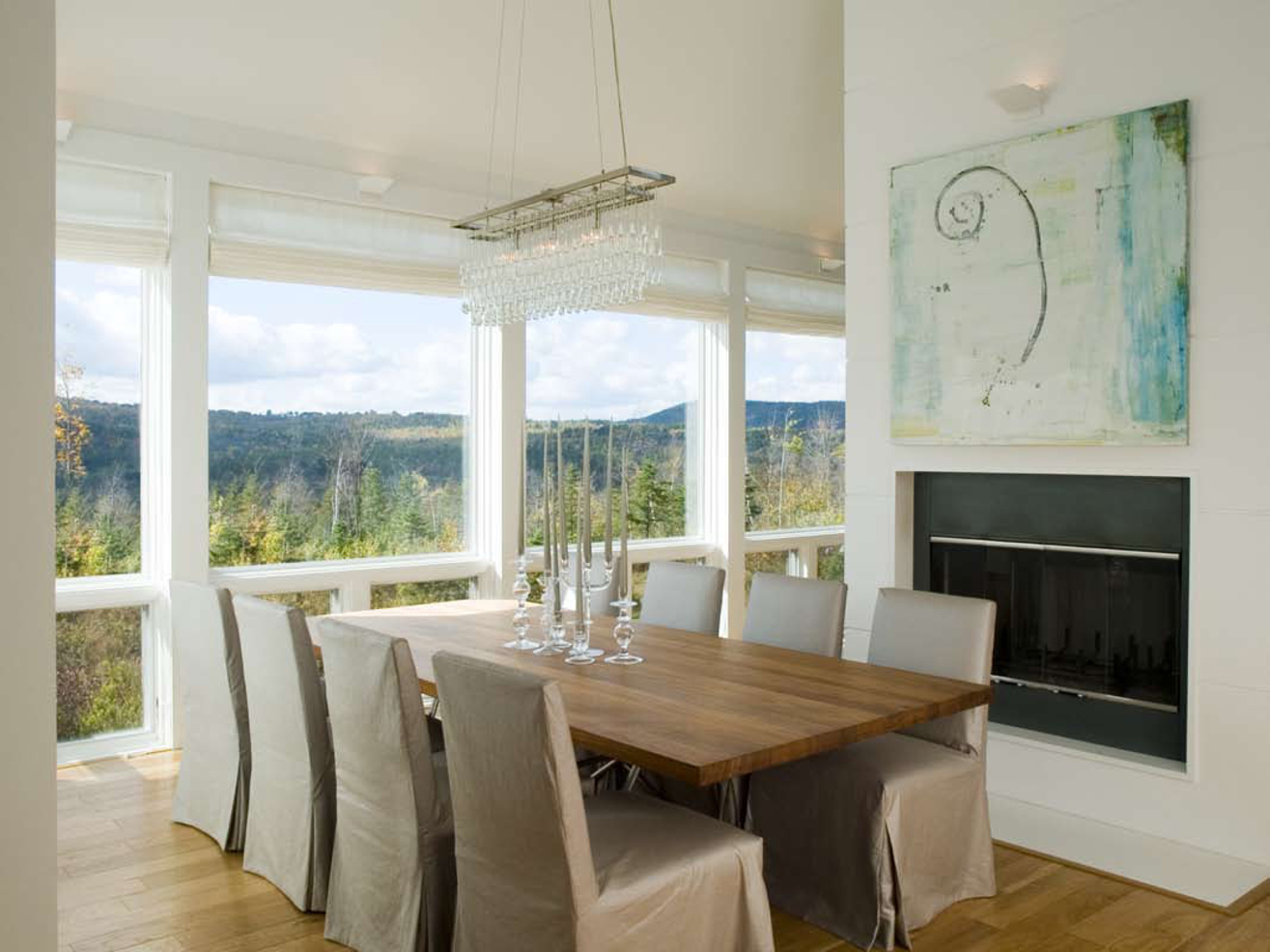 Miller Boehm Design, Designer with Principals, Detailing, Full DocumentationDeveloping out of a consideration of the connected farm house typology of New England, this house is broken into a series of volumes surrounding an open main living area. Connection to the magnificent surroundings is primary and emphasized with large floor to ceiling glass walls, delineated by wood members recalling timber framed farm buildings. Variations in siding patterns and window scales, as well as shading and trellis elements come together with a uniform color treatment, generating an elegant composition, well seated in the rolling hillside.