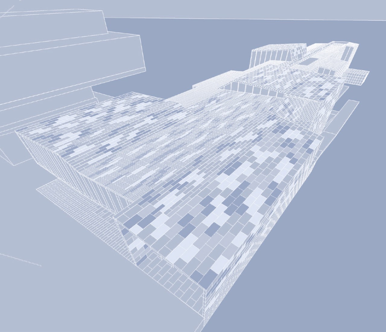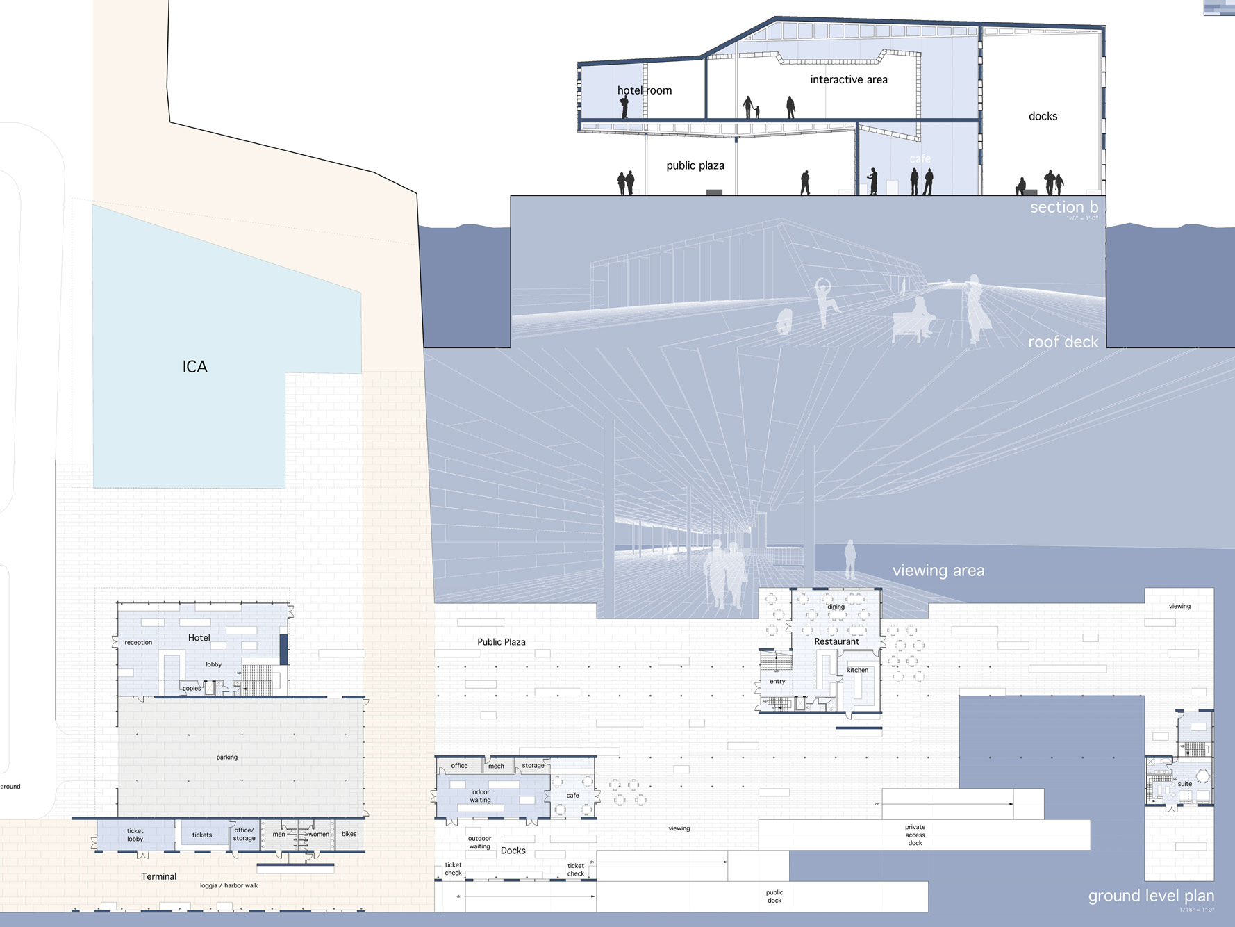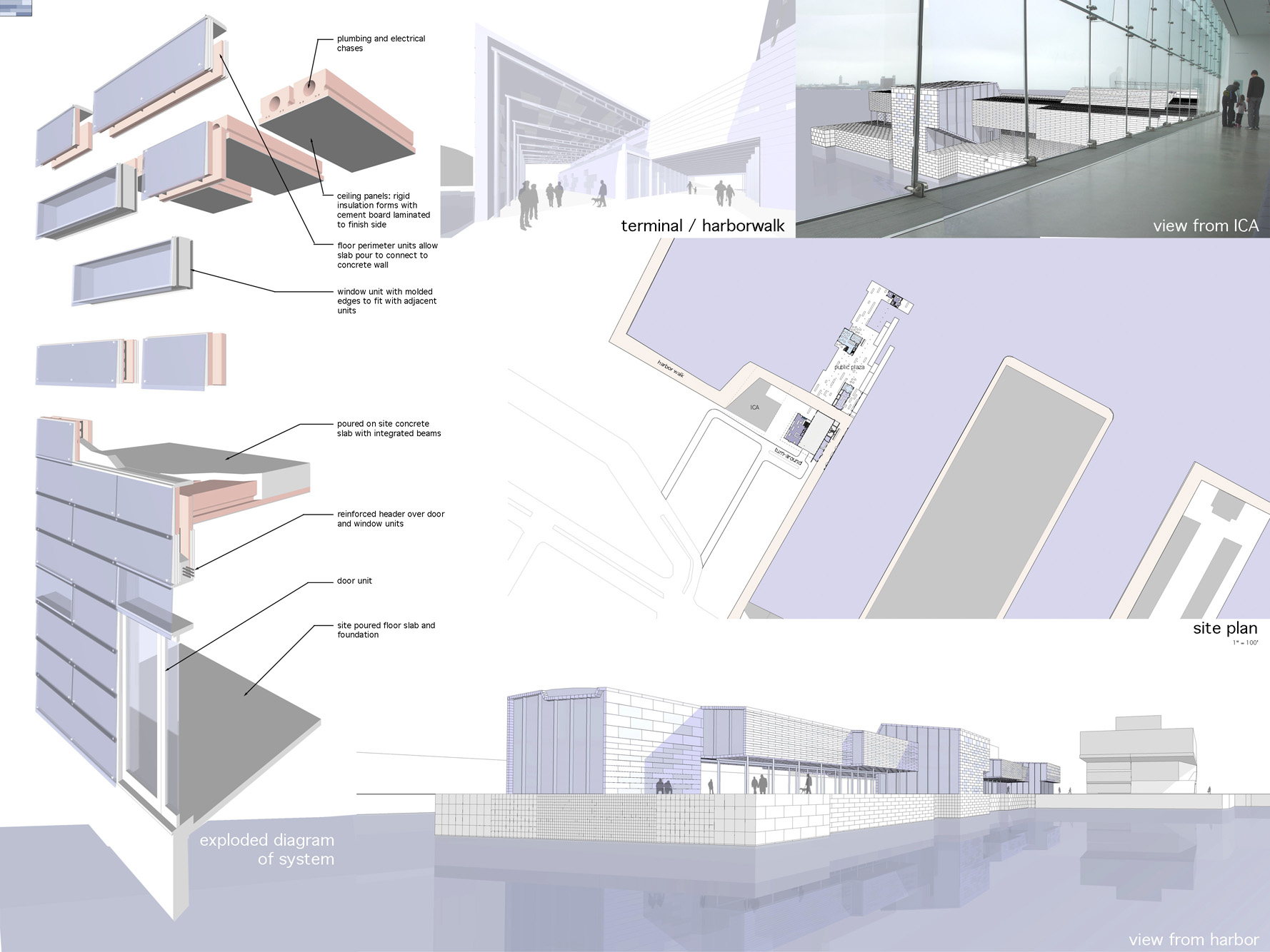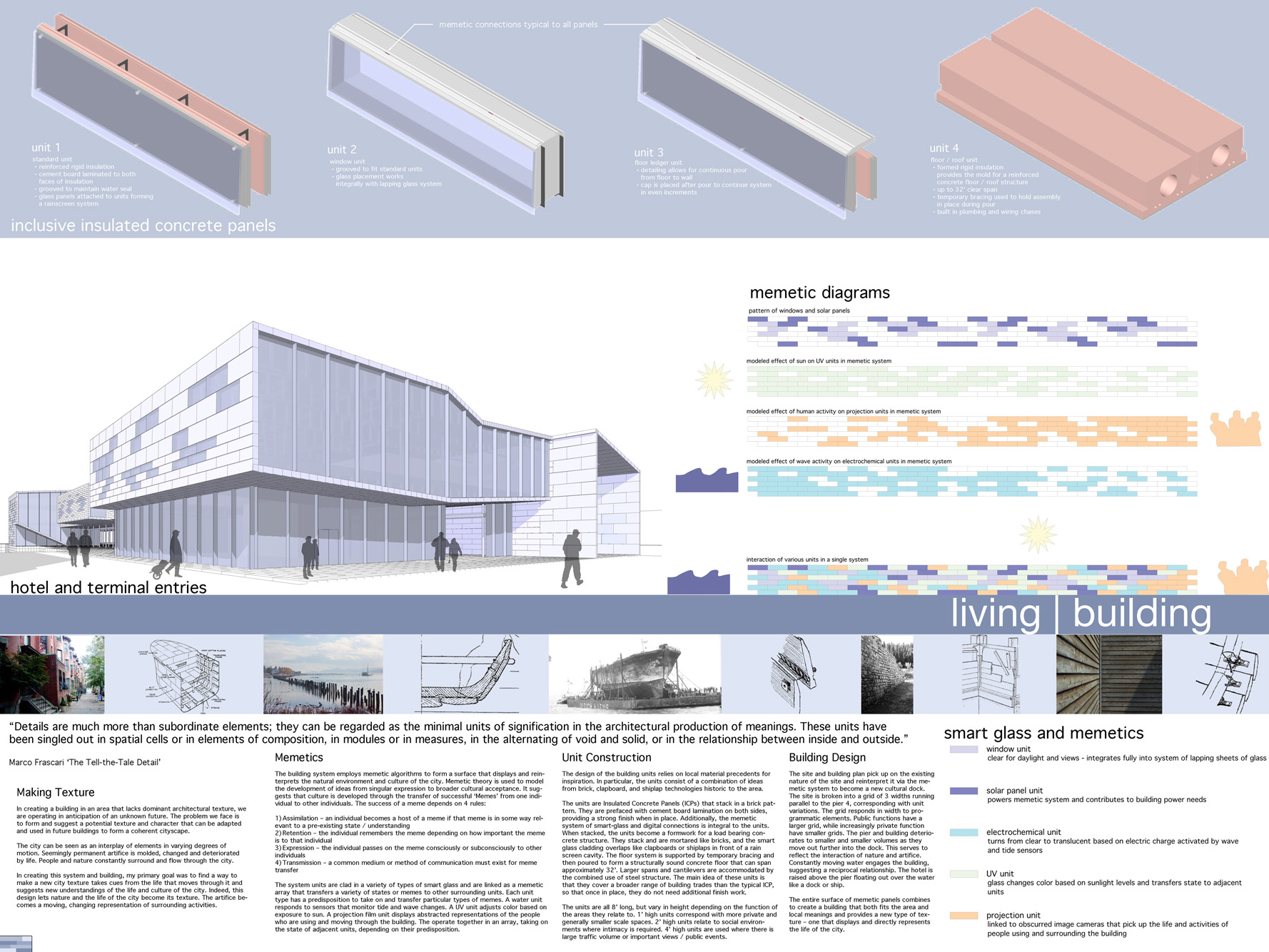 Memetic Hotel – Fort Point Channel, Boston, MAA kit of parts system for a new hotel that demonstrates and reinterprets the activities within. The system is a modified Insulating Concrete Form, which is designed to fit together with a variety of glazed rain screen face panels that represent the life of inhabitants. Views in and out of the building through standard glass panels, video representation of hotel activities are abstracted and displayed on led panels, and heat transfer is indicated through heat sensitive panels. The hotel itself serves to reinforce the experience of the pier, moving inhabitants along its length to a moment for observing the surrounding bay. The activated cladding experiments with memetics and the passing along of various idea sets from actor to actor. A scalar, maritime interpretation, moving away from building as symbolic object towards building as representation of real time activities and life experiences.
