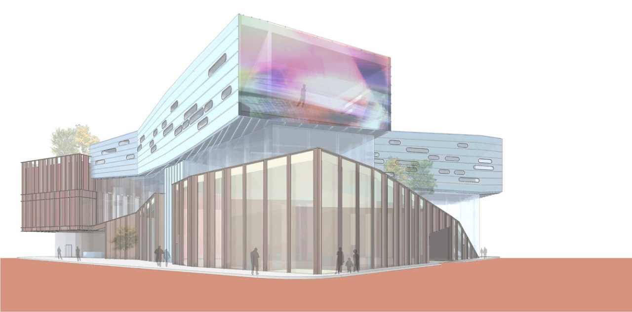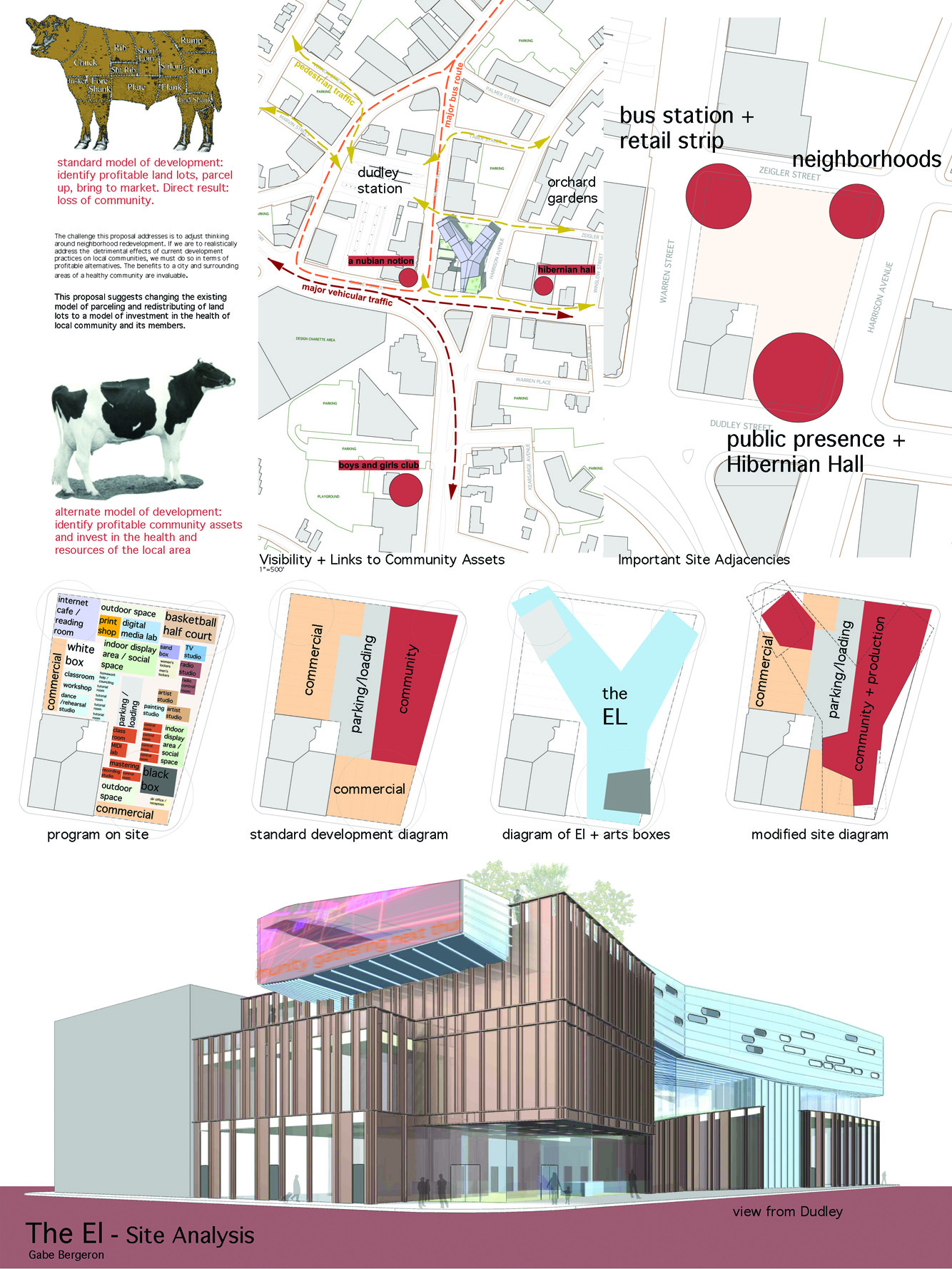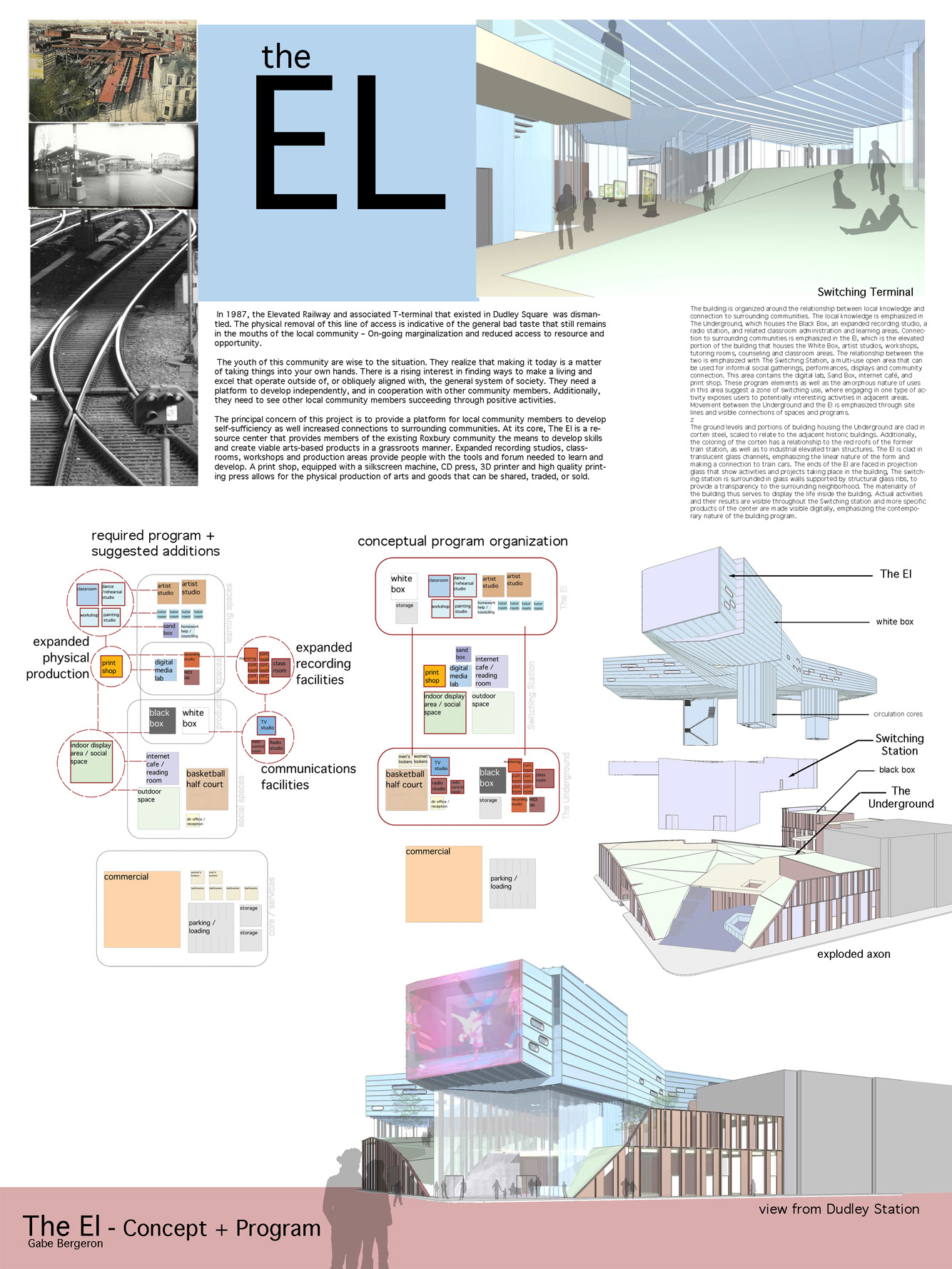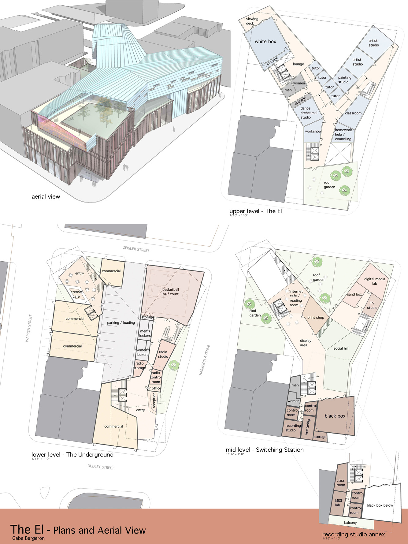Youth and Business Incubation Center – Dudley Square, Roxbury, MAA multifaceted community center highlighting the loss of the Elevated Railway and the parallel lack of government and social services provided to this vital collection of communities in Boston. The project suggests the reestablishment of access through the provision of arts and music programs centered around the youth of the community. The program is divided into two clusters, represented spatially and materially as “The Underground” and “the El”, housing community and education programs respectively. “The El” floats above “The Underground” providing an urban landscape for community events, art shows and gatherings. The life and creative developments of the building are represented inside and out through digital displays and sign boards, and high levels of visibility to the activities happening within.