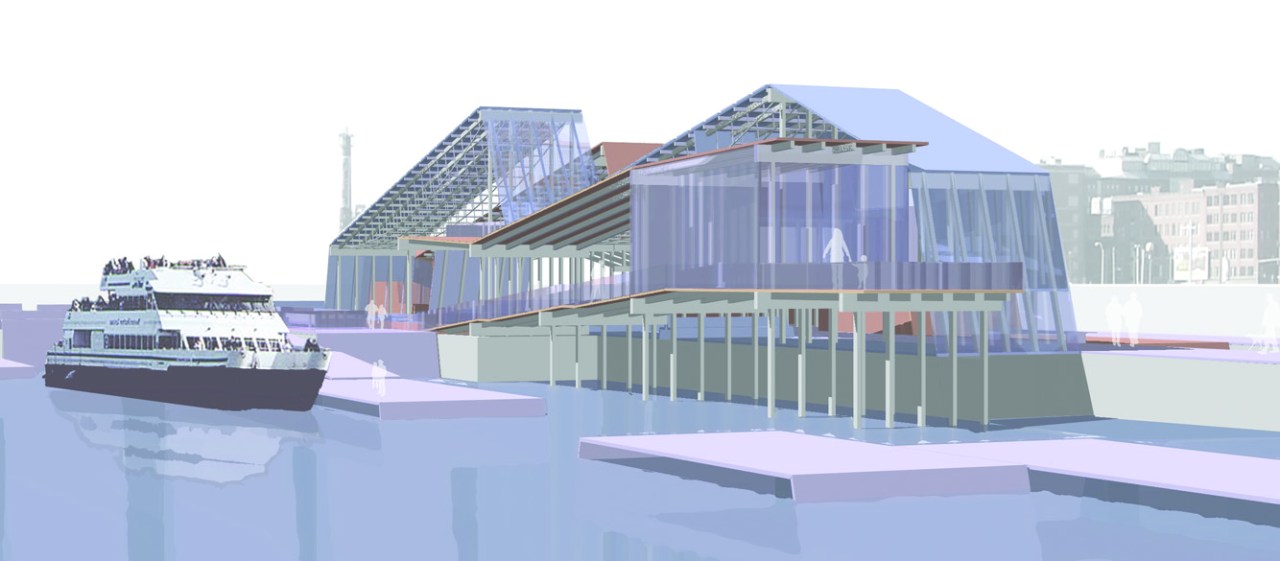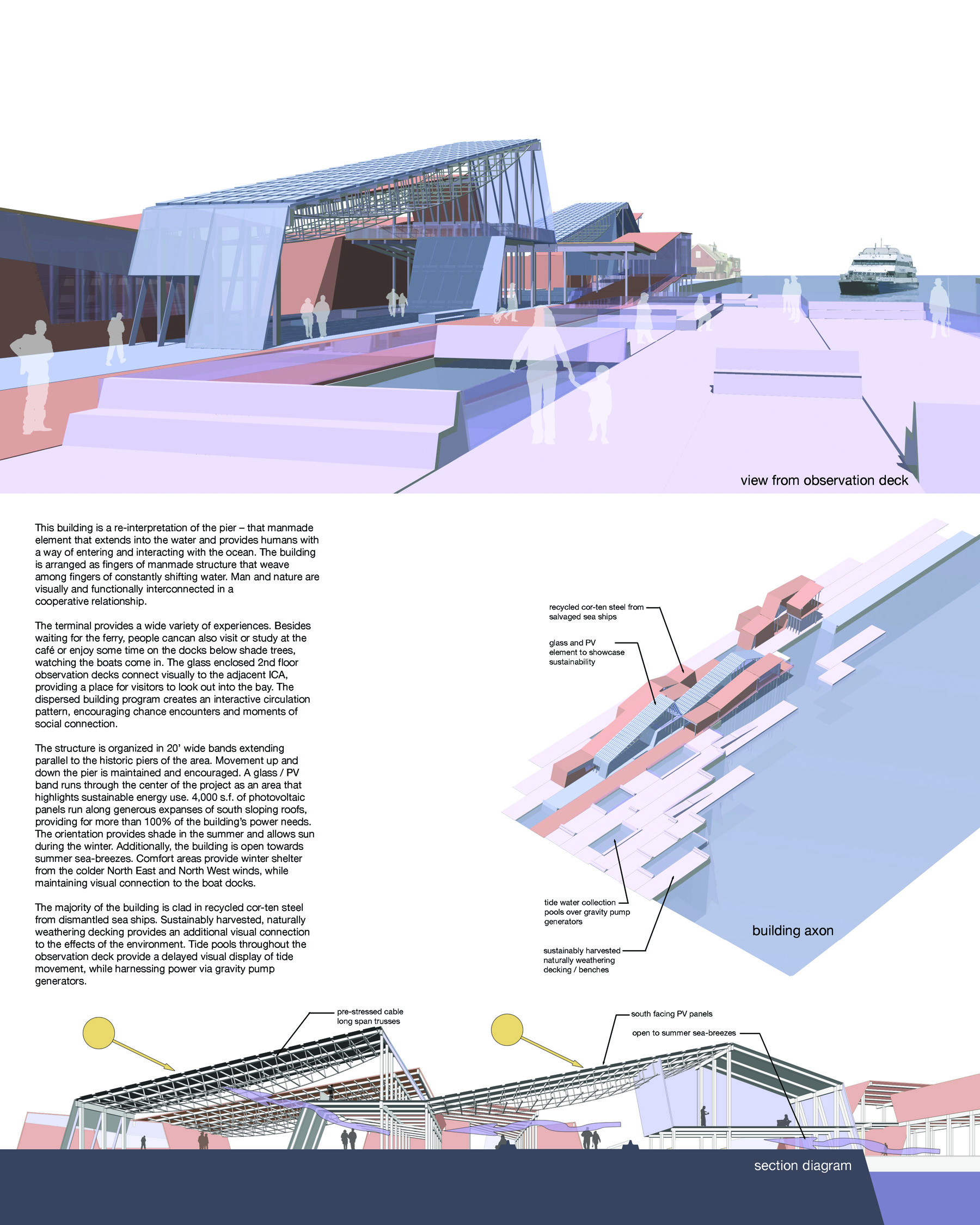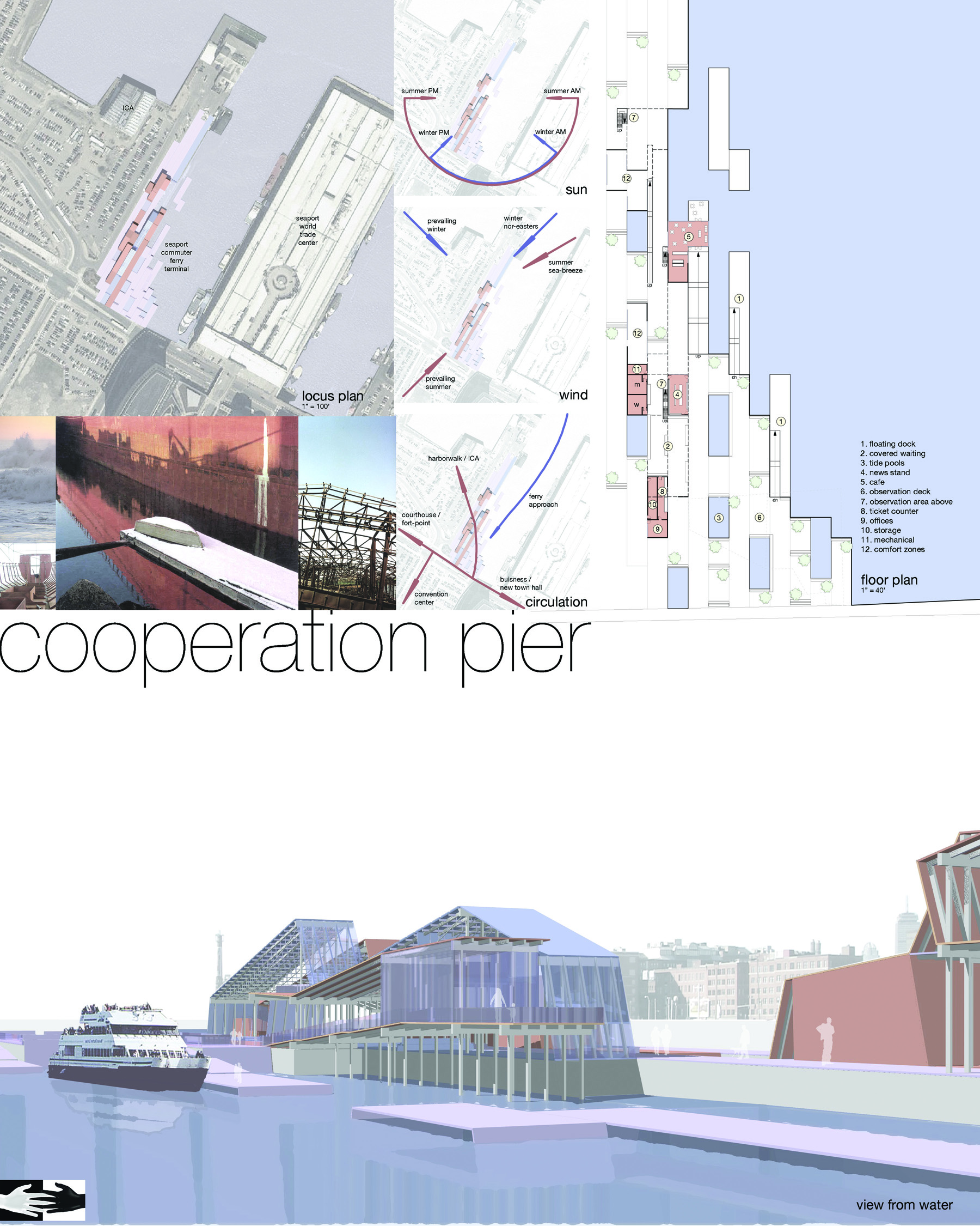 Transit Center – Fort Point Channel, Boston, MA Accepted as FinalistA new transit center picking up on the language of shipyards and piers – the decking and walkways fold up to become benches, shelters, and buildings. Solar orientation is maintained to allow for a self-powered station, with energy supplements from tidal pools. A café overlooks the coming and going of Boston Water Taxis.
