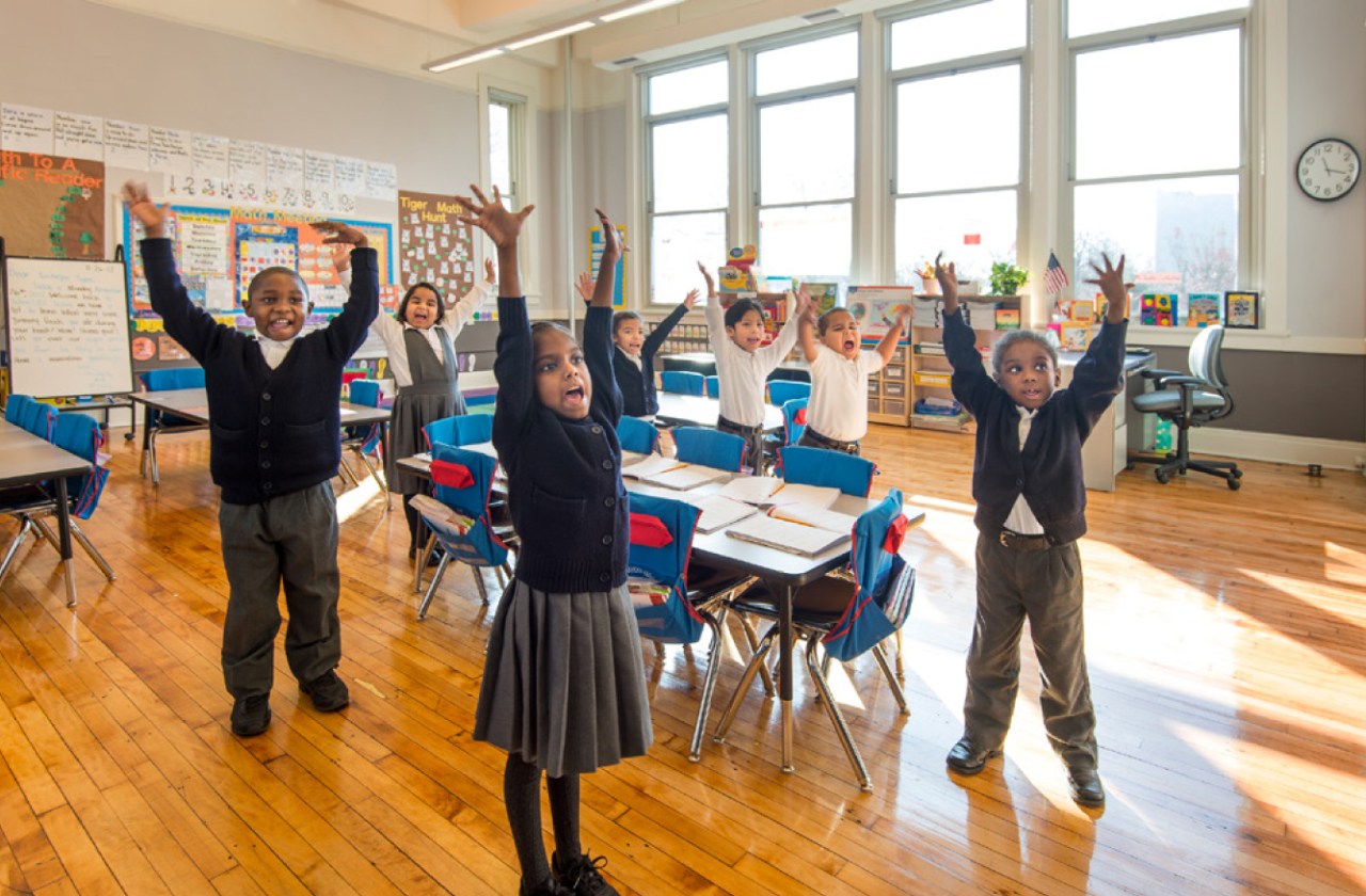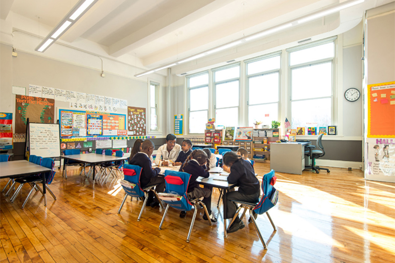 Andersen Miller Design, Detailing, Client Presentation, Construction Documentation, Construction AdministrationThe transformation of a former Catholic school into a K-8 charter school in an underserved area of Brooklyn. The project consists of a deep renovation to a building that was half developed in the 1920s and added to in the 1950s. Additions of an elevator, completely new plumbing, kitchen and bathrooms, custom built-in reception areas, and a new library, along with restored wood flooring, and new lighting and finishes, reinvigorate the structure into a subtle and elegant space for learning.