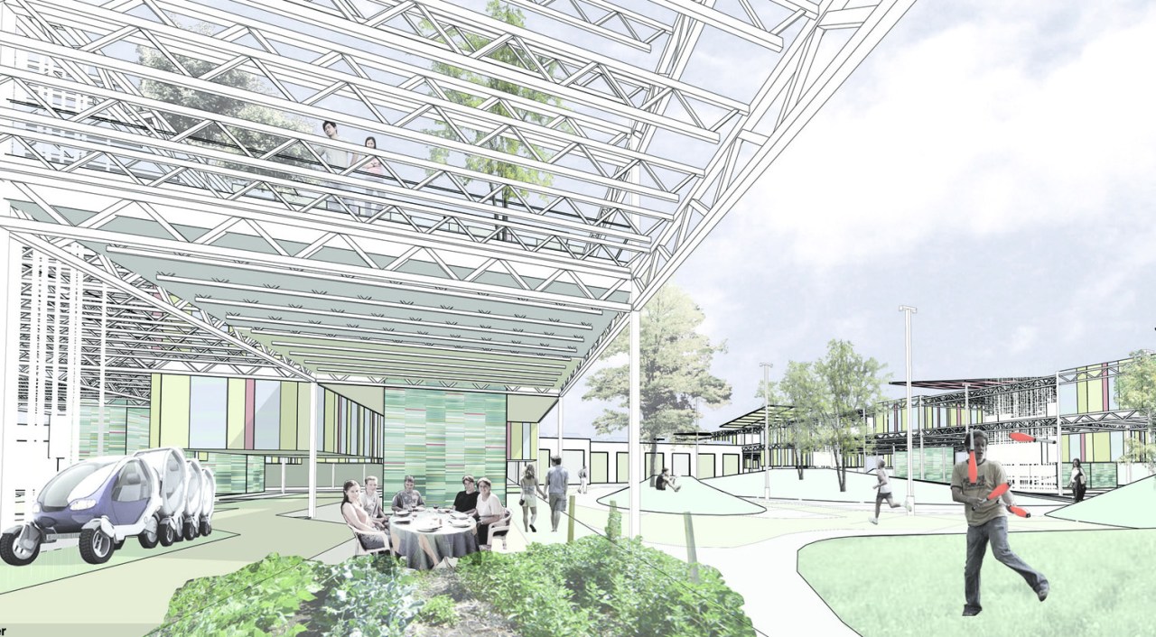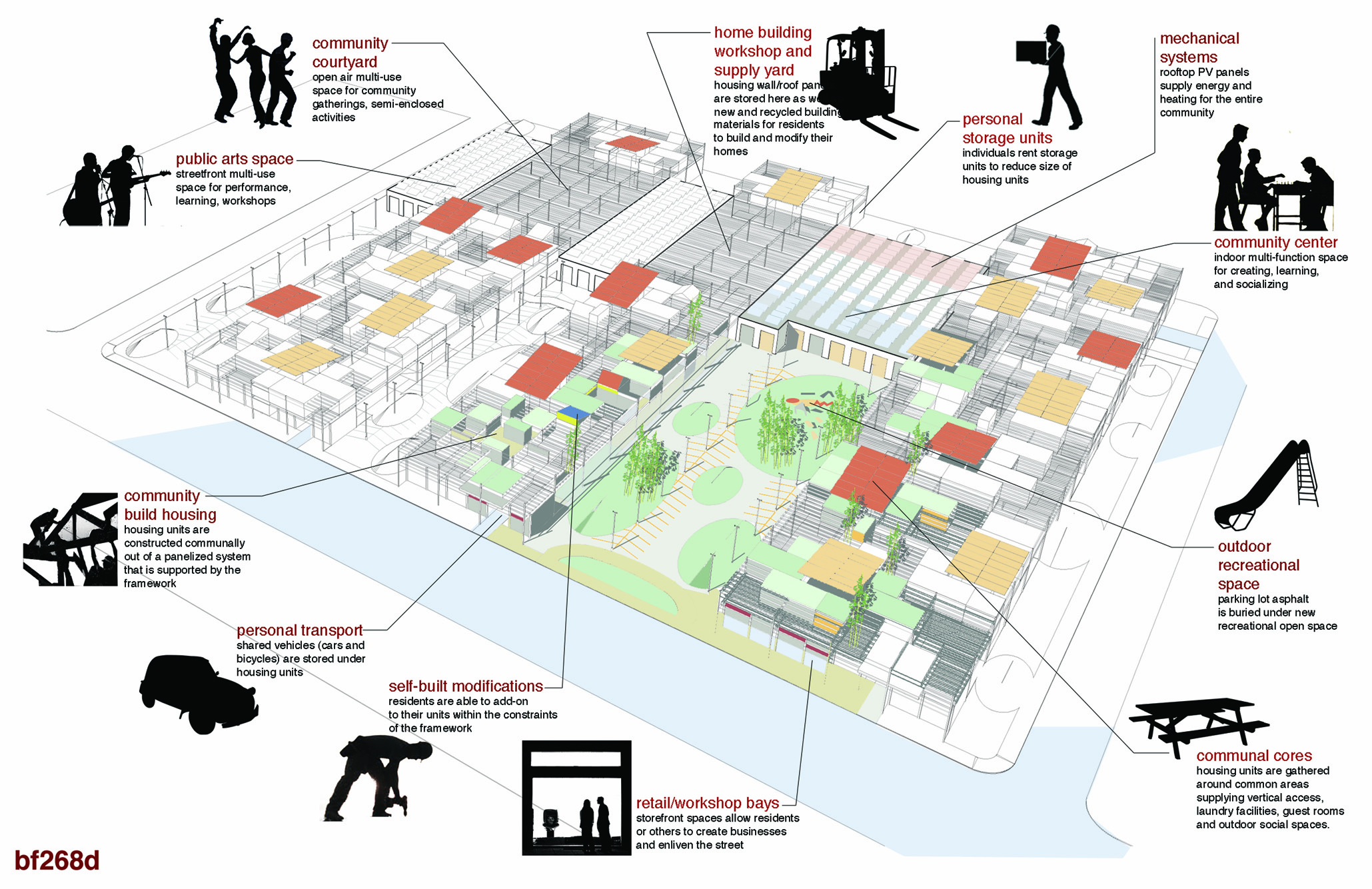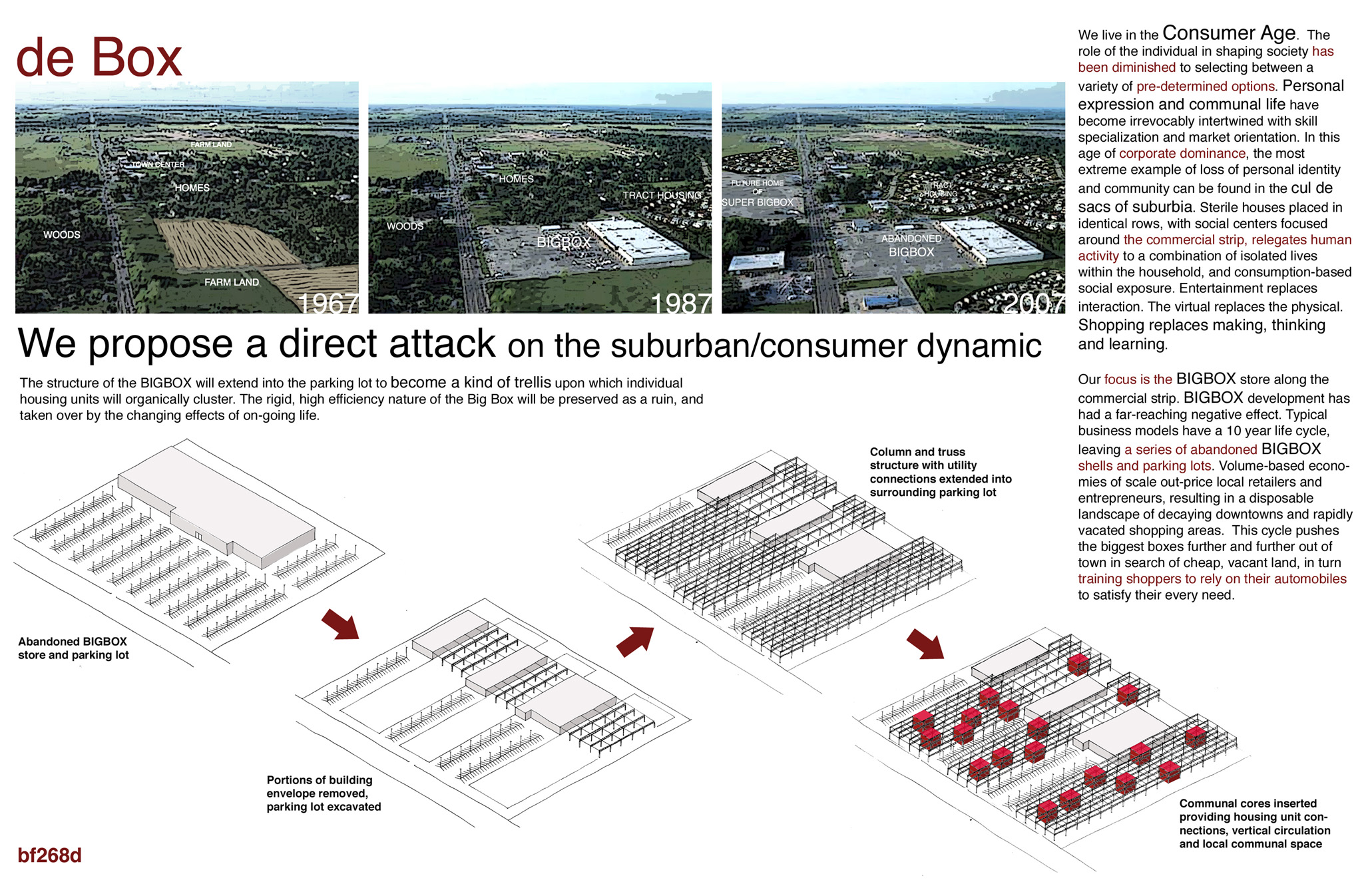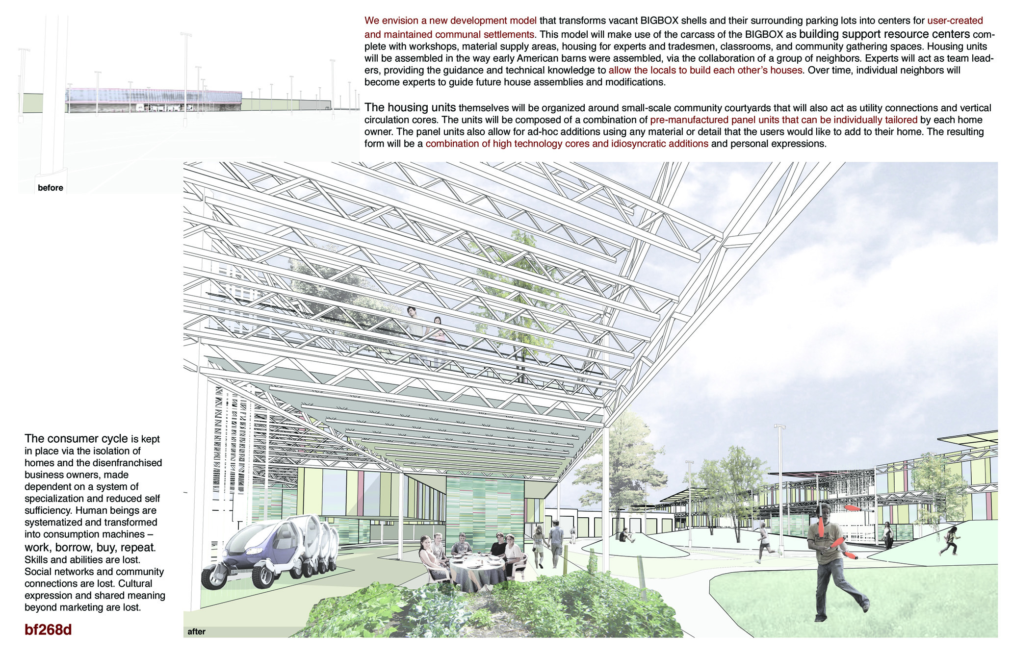 Boehm Architecture, Designer with Team, Renderings and Presentation Published Entry, Self-Fab Housing, 2009Critically considering consumerism and homogenous vehicles of product delivery, this project directly confronts the big box store phenomenon, suggesting dismantling and reusing abandoned big box structures as structure/infill centers for self made housing. A new version of the eco-village, transforming a primary symbol of the dissolution of local culture into an intentional community towards greater self sufficiency. Neighbors supporting neighbors. Barn building. Parking lot lawn gatherings.